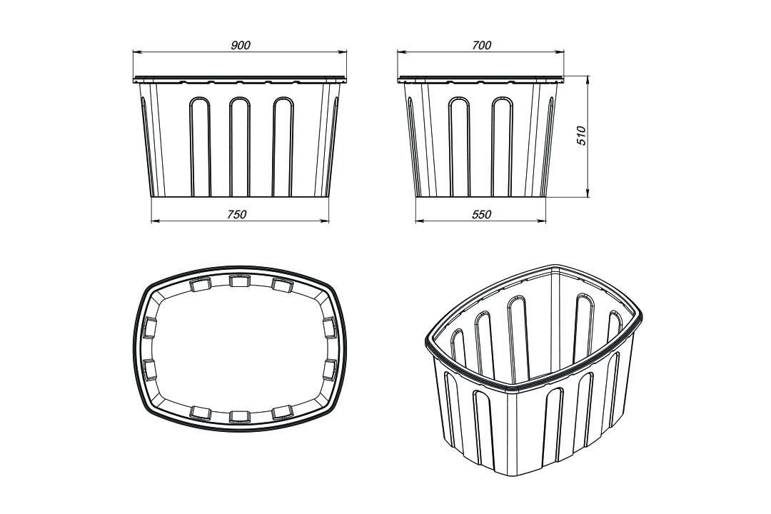 Форма ванны заужена в нижней части, что позволяет складывать ванны одна в другую (штабелировать), что упрощает транспортировку и хранение. Ванны проходят в дверной проем.